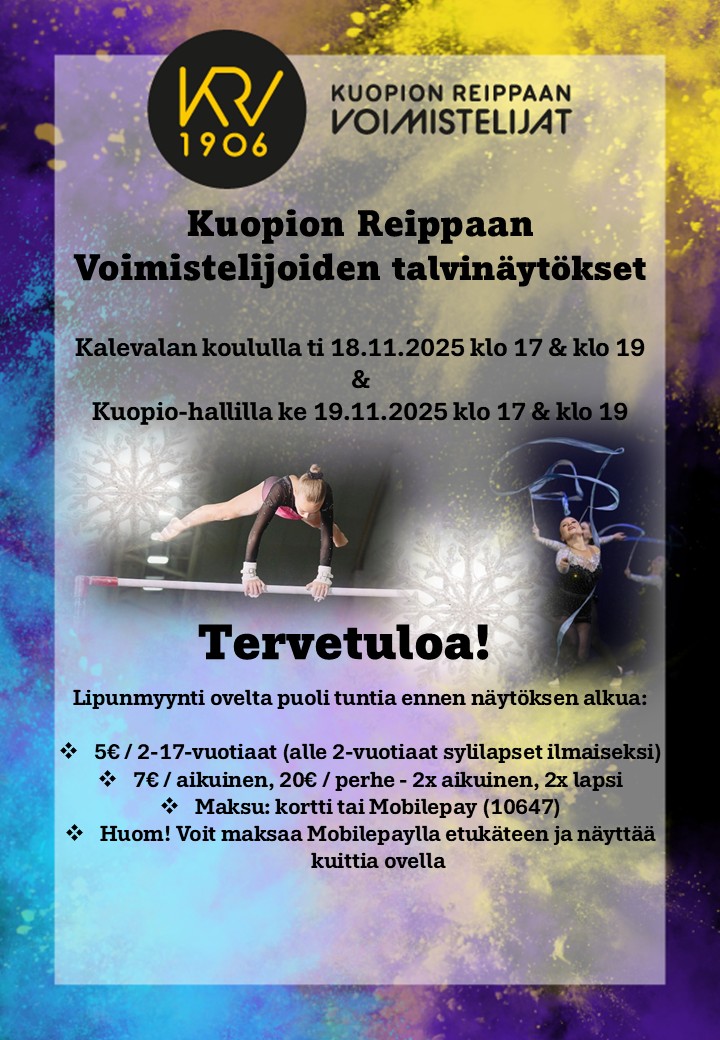 Kuopion Reippaan Voimistelijat on Suomen vanhimpia voimisteluseuroja ja yksi alueen suurimmista seuroista. Liikutamme vuosittain yli 1200 jäsentä. Tuntitarjonnassamme on monipuolisia tunteja kaikenikäisille ja -tasoisille liikkujille sekä harrastajille että kilpavoimistelijoille.